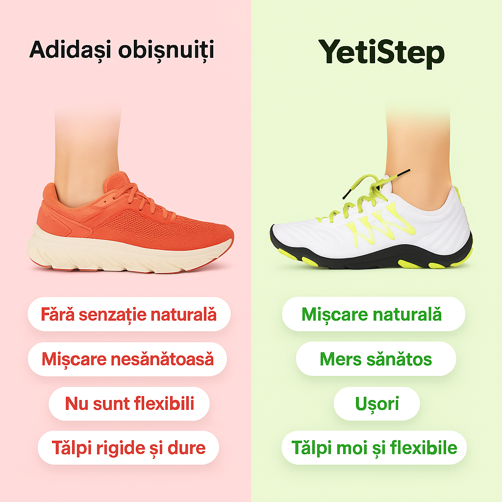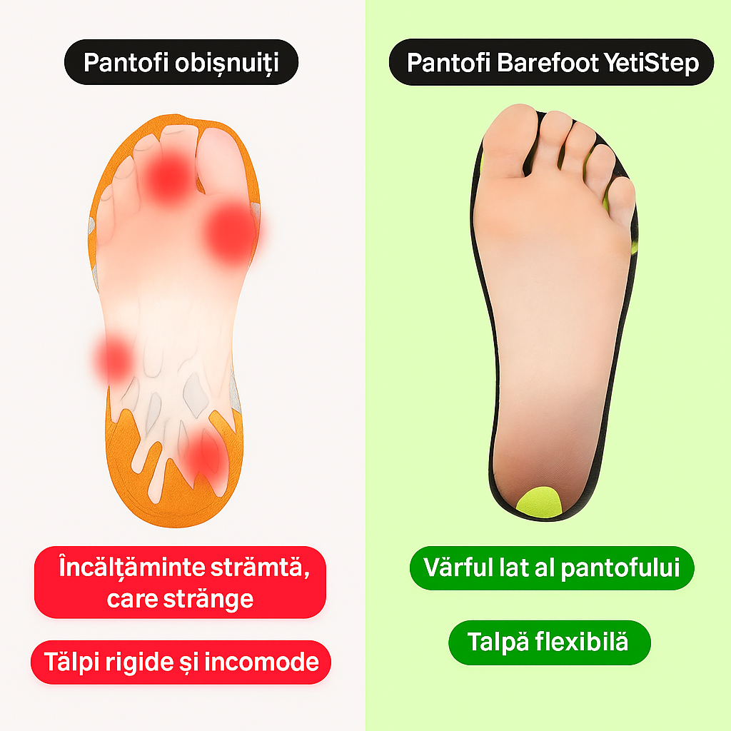Te dor picioarele? Pantofii obișnuiți sunt prea rigizi și pot provoca dureri în picioare, genunchi sau spate. Pantofii YetiStep rezolvă rapid această problemă. Cu tălpi subțiri și flexibile, aceștia permit piciorului să se miște natural, exact cum a fost conceput de natură.